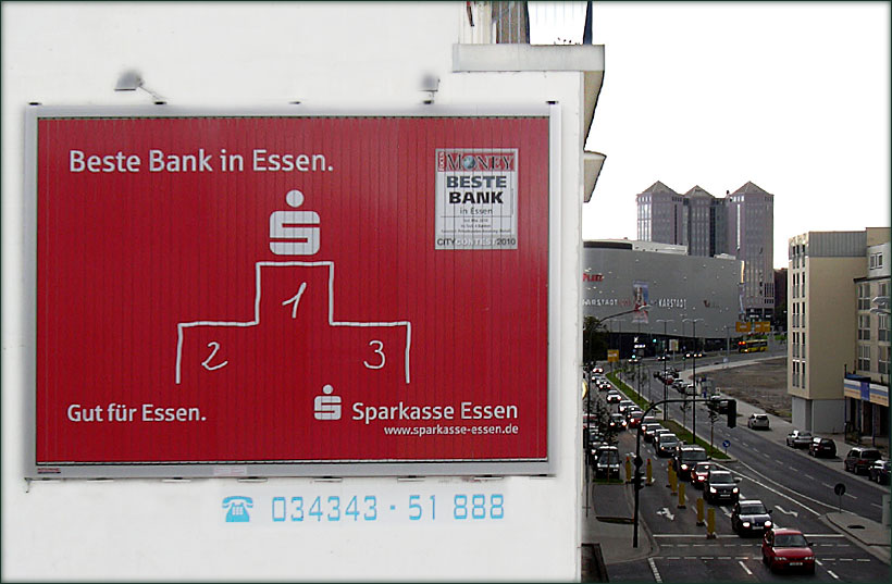 (Zur Galerieansicht Bild anklicken) | | | Standort: | | direkt in der City von Essen Friedrich Ebert Straße aus Richtung Viehofer Platz sowie Gladbecker Straße in Richtung Berliner Platz und Limbecker Platz, hier ist noch eine statische Werbetafel zu sehen, welche durch unsere Prismenwerbeanlage ersetzt wurde | | Abmessungen: | | 6,00 x 4,00 Meter | | Kontaktchancen: | | ca. 120.000 täglich | | Besonderheiten: | | Anlage mit Beleuchtung! | | MediaMarkt: | | gleich live ansehen | | Bauhaus-MediaMarkt: | | gleich live ansehen | | Kartenansicht: | | |