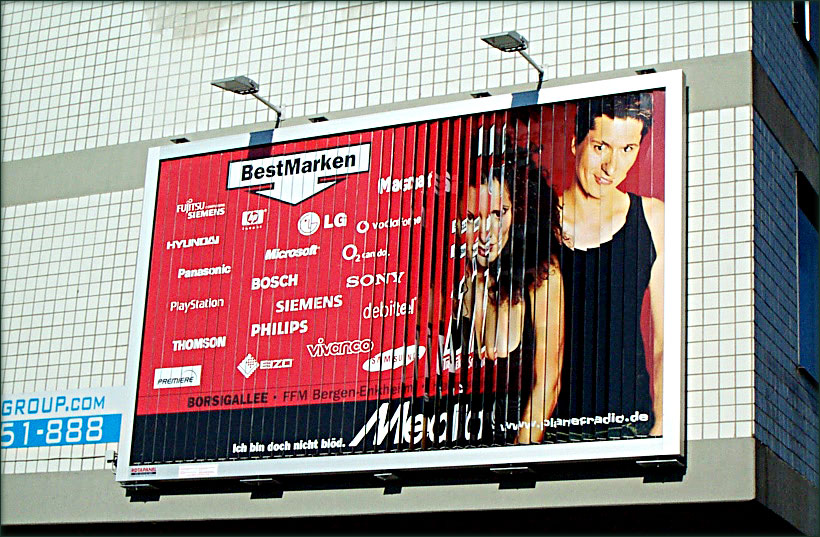 (Zur Galerieansicht Bild anklicken) | | | Standort: | | direkt in der City von Frankfurt - stadtauswärts Hanauer Landstraße kurz vor der Kreuzung Dieselstraße - 90 Grad zur Hanauer Landstraße in Richtung Dieselstraße/Hanau - an der Giebelfront Hanauer Landstraße neben Burger King | | Abmessungen: | | 5,00 x 3,00 Meter | | Kontaktchancen: | | ca. 100.000 täglich | | Besonderheiten: | | Anlage mit Beleuchtung! | | MediaMarkt: | | gleich live ansehen | | Bauhaus-MediaMarkt: | | gleich live ansehen | | Kartenansicht: | | |