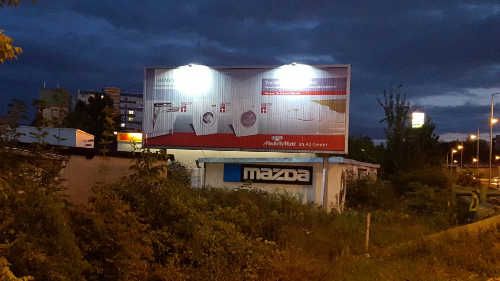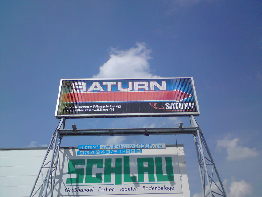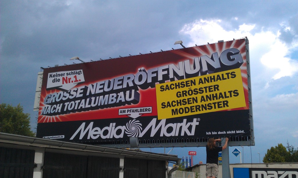 (Zur Galerieansicht Bild anklicken) | | | Standort: | | direkt in der City von Magdeburg - Südanlage Cityring Magdeburg Stadtautobahn (B71) zwischen den Abfahrten Kirchweg und Wiener Straße - ca. 80 Grad zum Cityring - vom Cityring einzusehen in Richtung Norden bzw. Stadtmitte | | Abmessungen: | | 10,30 x 3,30 Meter | | Kontaktchancen: | | ca. 200.000 täglich | | Besonderheiten: | | Anlage mit Beleuchtung! | | Kartenansicht: | | |