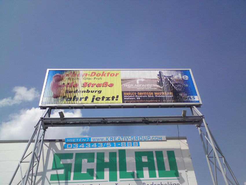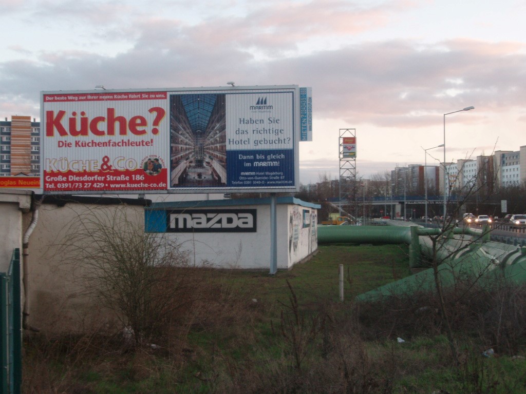(Zur Galerieansicht Bild anklicken) | | | Standort: | | direkt in der City von Magdeburg - Nordanlage Cityring Magdeburg Stadtautobahn (B 71) zwischen den Abfahrten Pfahlberg und Ebendorfer Chaussee - ca. 90 Grad zum Cityring - vom Cityring einzusehen aus Richtung Norden (A2) in Richtung Süden bzw. Stadtmitte | | Abmessungen: | | 10,00 x 4,00 Meter | | Kontaktchancen: | | ca. 200.000 täglich | | Besonderheiten: | | Anlage mit Beleuchtung! | | Kartenansicht: | | |